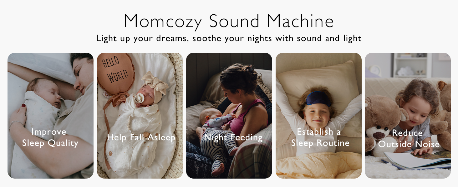 Momcozy Smart Baby Sound Machine with app control, showcasing white, color, and rainbow lighting for baby sleep.
