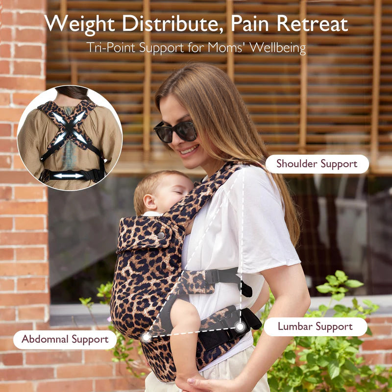 Momcozy PureHug leopard print baby carrier, offering comfortable and stylish babywearing for mothers.