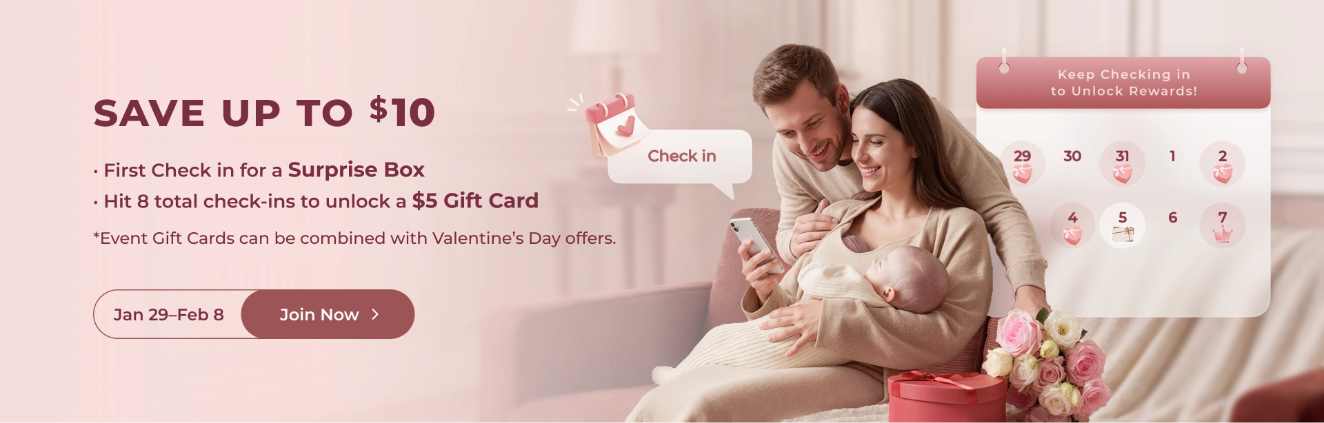3. El primer check-in del evento desbloqueará una caja regalo sorpresa, que puede contener tarjetas regalo o CozyCoins. Se desbloquearán cajas regalo sorpresa adicionales —con tarjetas regalo o CozyCoins— al realizar check-in durante 3, 5 o 7 días consecutivos. Las tarjetas regalo obtenidas en el evento caducarán el 11 de febrero a las 23:59 (EST).