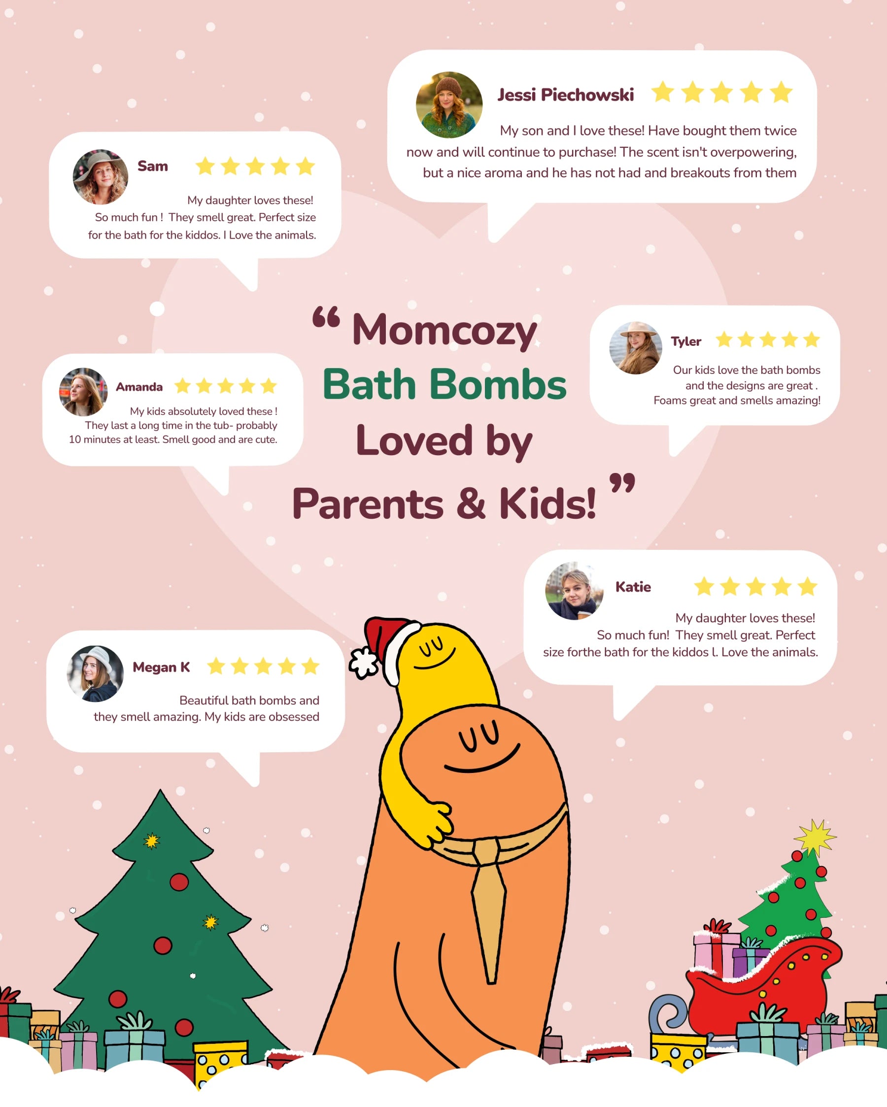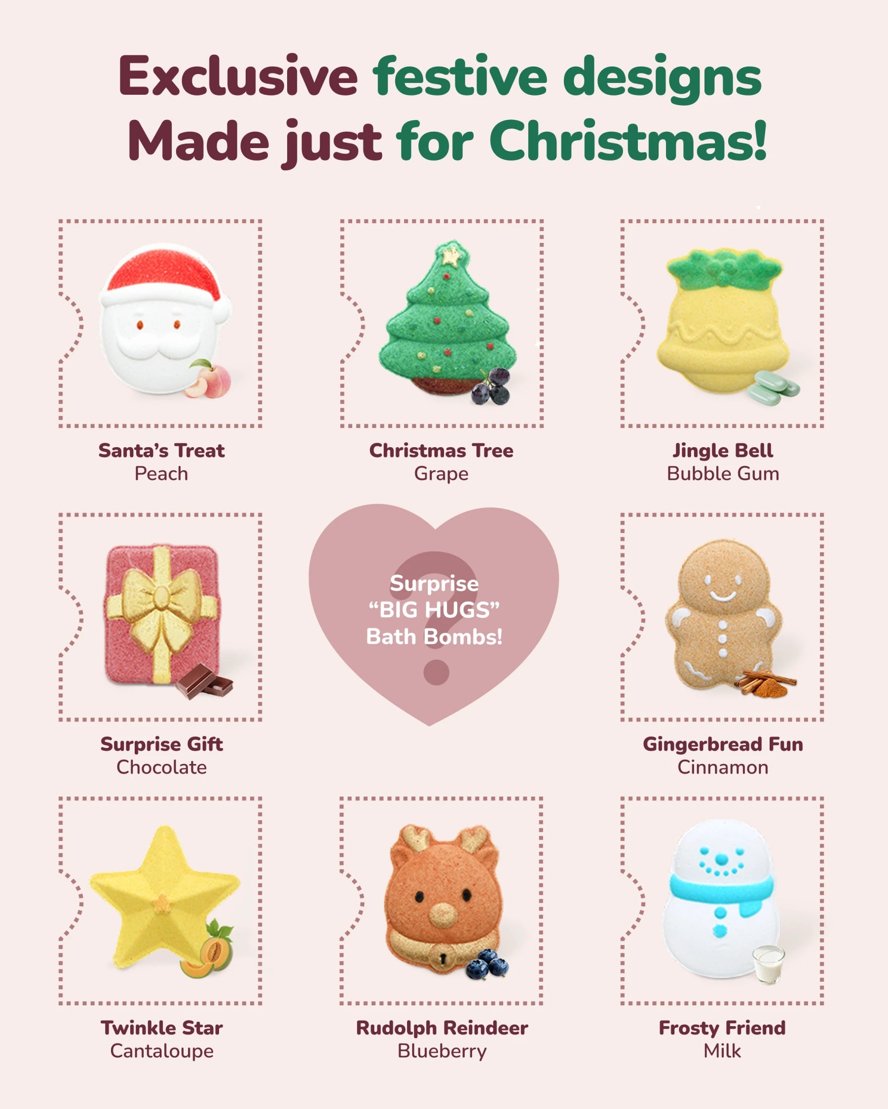 - 14 Christmas-Exclusive Bath Bombs: Enjoy 14 festive bath bombs, including Christmas trees, snowmen, and holiday friends. Each shape adds playful surprise to every bath, making kids excited to bathe.