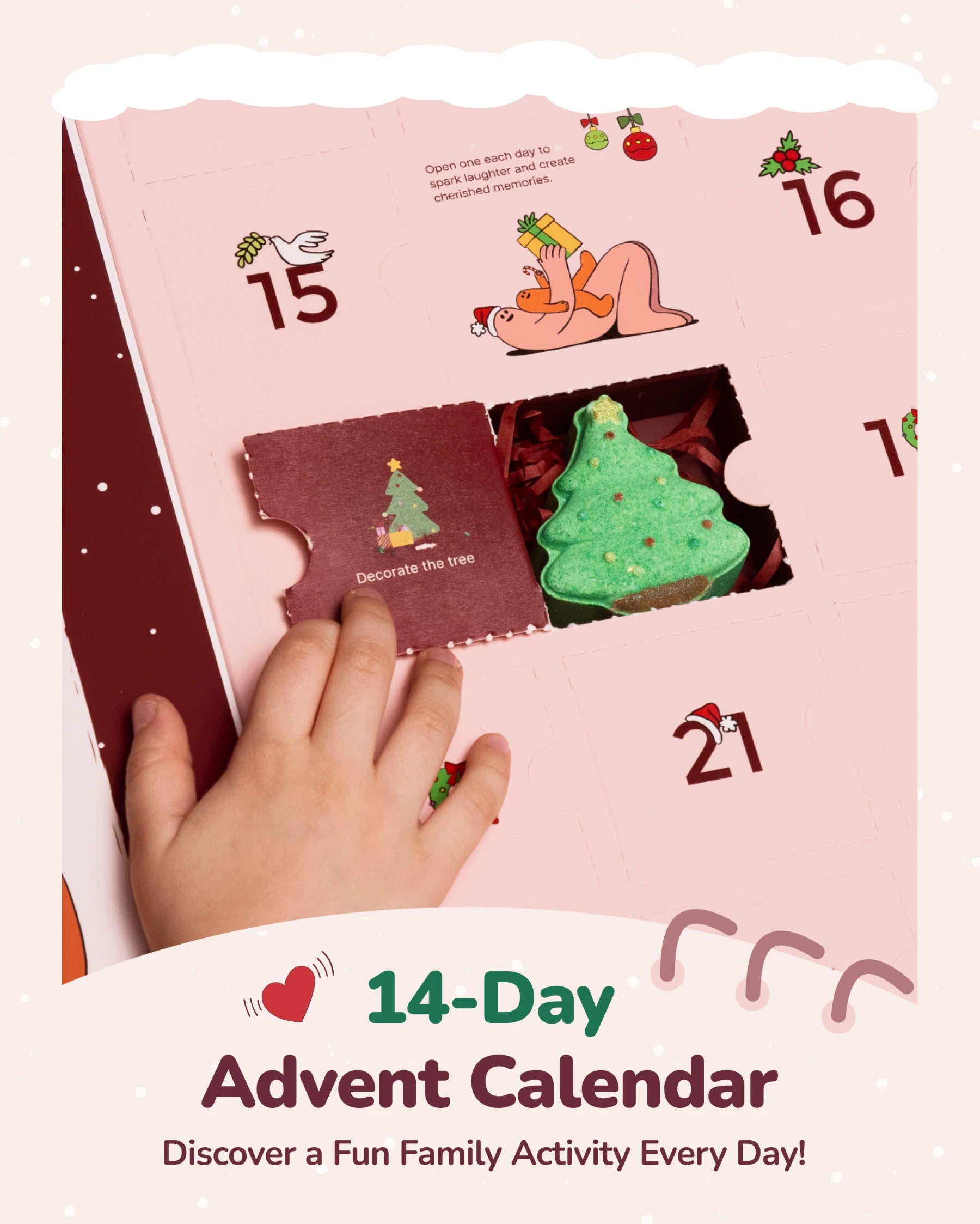 - 14-Day Advent Family Activity Calendar: Starting December 12, unwrap a bath bomb and activity card each day. Enjoy 14 family-inspired holiday activities that create laughter, connection, and lasting memories.