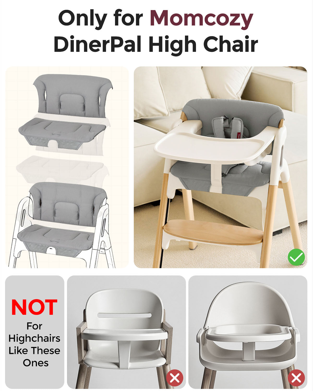 Momcozy DinerPal High Chair, designed to grow with baby from 6 months through adulthood, offers 5 seating modes from baby set to adult chair and supports up to 308 lbs. With adjustable seat and footrest positions, it ensures ergonomic comfort at every stage. Safety features include a five-point harness, stable triangular frame, and silicone rubber feet. The spacious, dishwasher-safe tray fits most suction bowls, and the chair is easy to clean with a wipeable surface and machine-washable harness. Built with quality FSC-certified beechwood and FDA-approved plastic to protect baby's health and for your peace of mind.