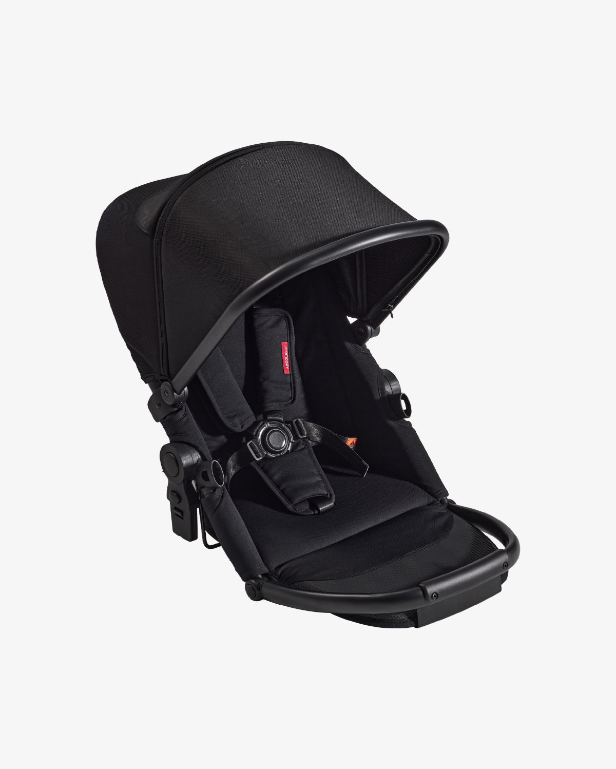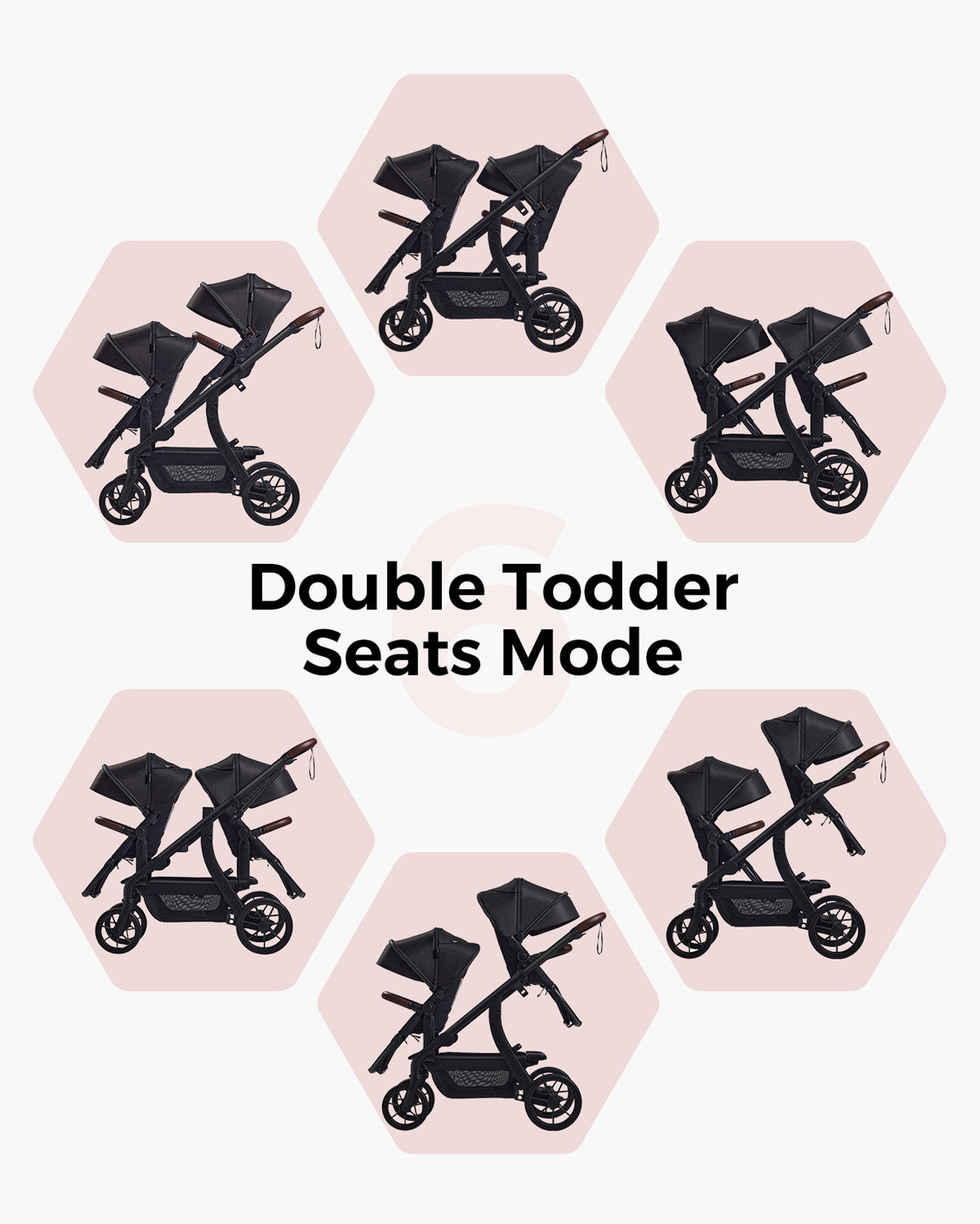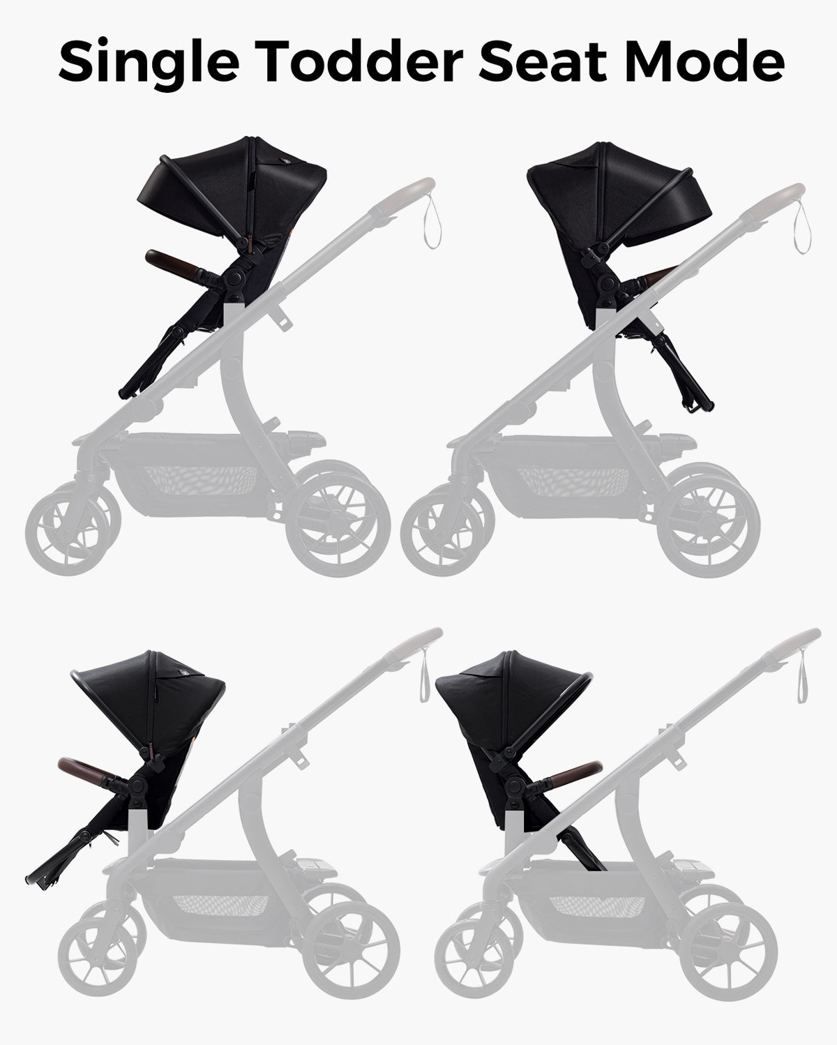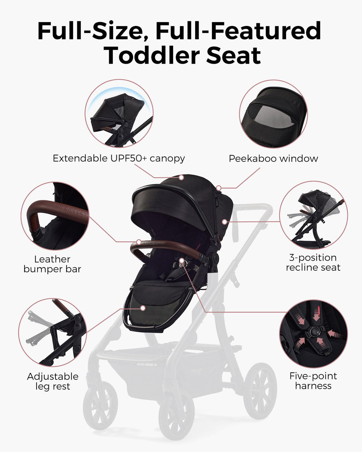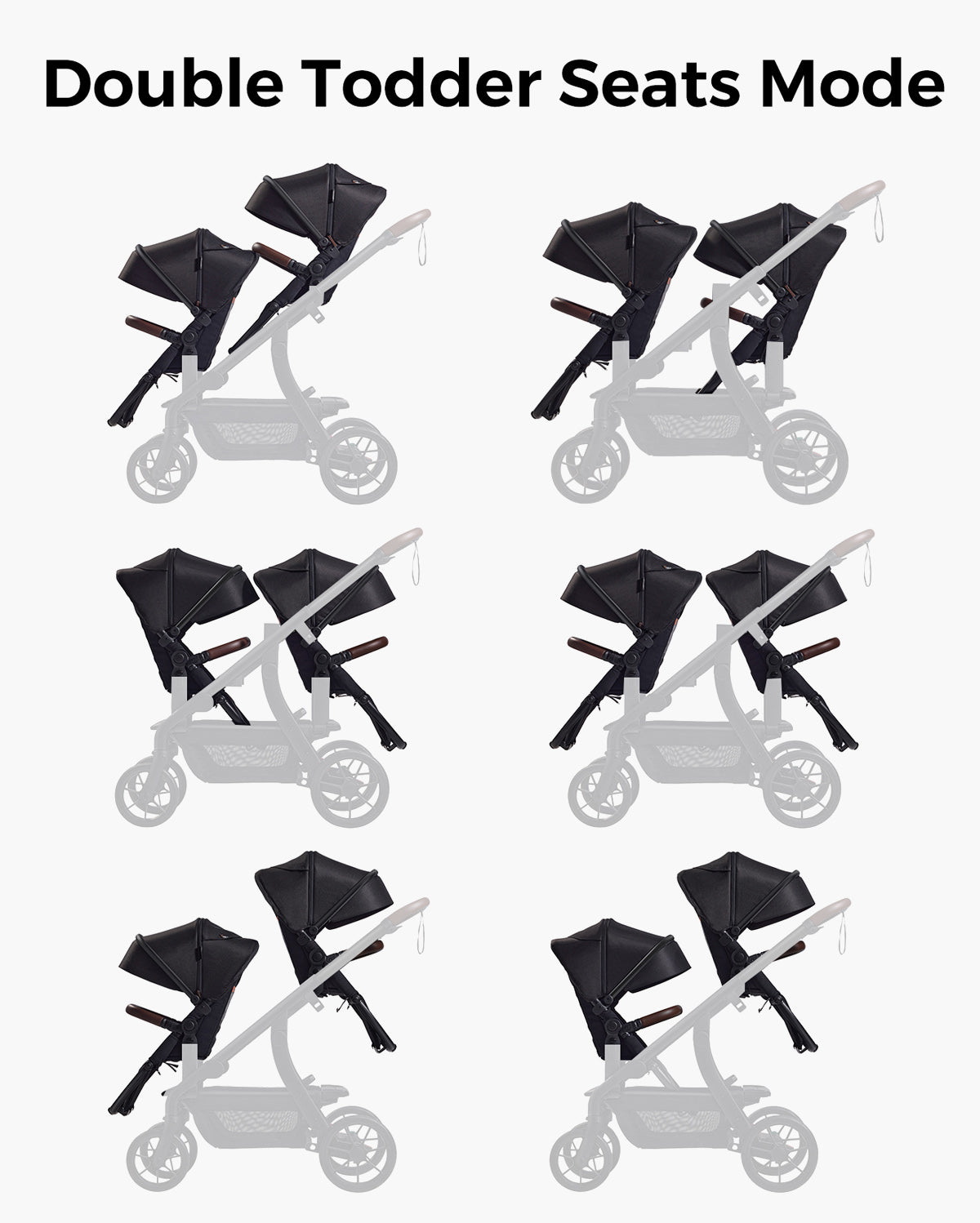 Add a second toddler seat to accommodate 2 sibs or twins from 6 months to 3 years old. Both seats hold up to 50 pounds and feature multiple recline angles, an extendable UPF50+ sun canopy, and a leather bumper bar.