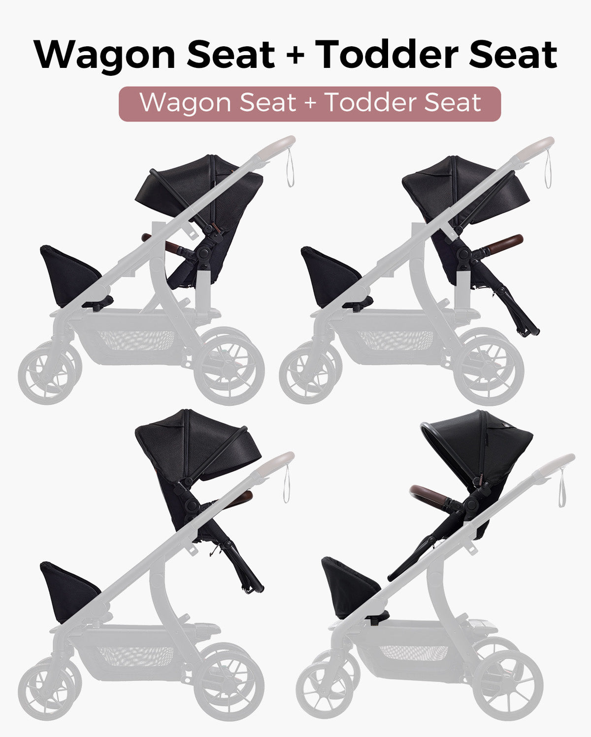 Transform the stroller into a wagon with 2 wagon backrests, perfect for your growing kids and their next big adventure.