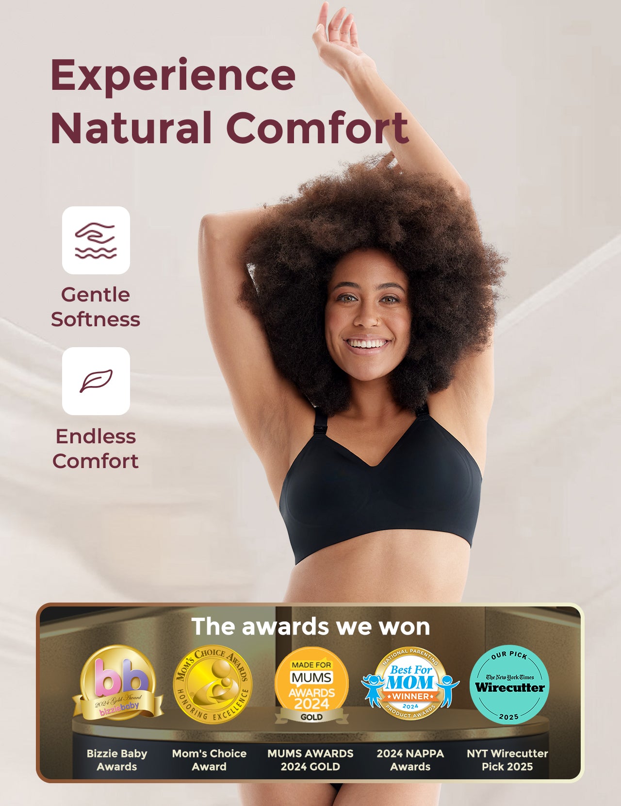 Smiling model in light nude Seamless Nursing Bra YN21. Highlights comfort, Bizzie Baby, Mom's Choice, Mums 2024 Gold awards.