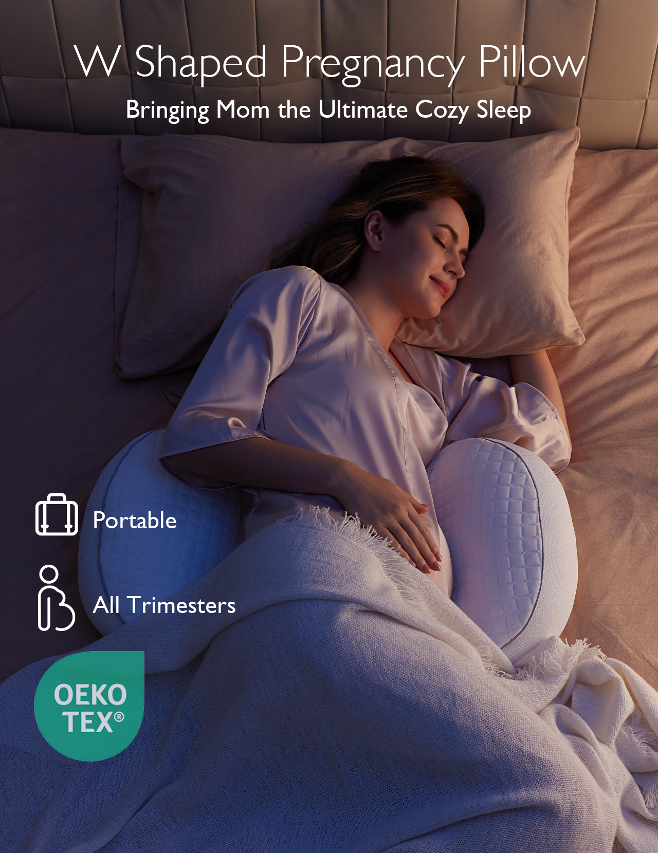 - Coussin de grossesse en forme de W – Conçu pour épouser les courbes des femmes enceintes, ce coussin de maternité s'adapte parfaitement au corps et offre un soutien optimal au ventre, au dos et aux hanches, tout en vous aidant à maintenir la position de sommeil sur le côté recommandée par les médecins. Il procure un confort exceptionnel, soulage les douleurs et favorise un repos réparateur aux futures mamans.