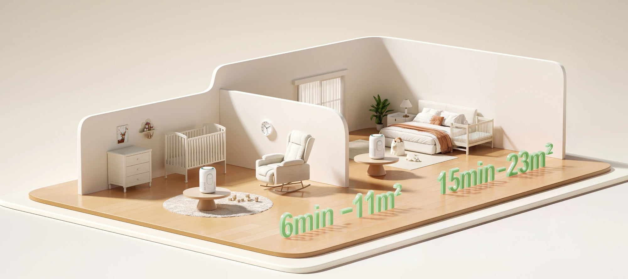 Compact et idéal pour les chambres de bébé, il nettoie les pièces jusqu'à 23 m² en seulement 15 minutes.