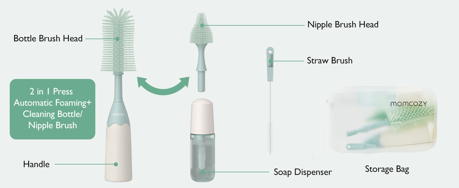 - Outils de nettoyage polyvalents:Le kit de brosses Momcozy comprend différentes têtes pour répondre à tous vos besoins :tête de brosse pour biberons et tire-lait, tête inclinée pour tétines, et brosses en silicone pour les ouvertures étroites comme les pailles.