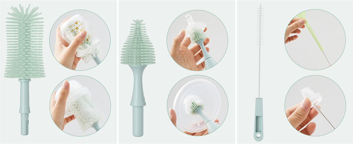 - Nettoyage complet à 360° :Grâce à plusieurs accessoires adaptés aux différents diamètres, ce set permet de nettoyer facilement tous les recoins et angles de vos biberons.