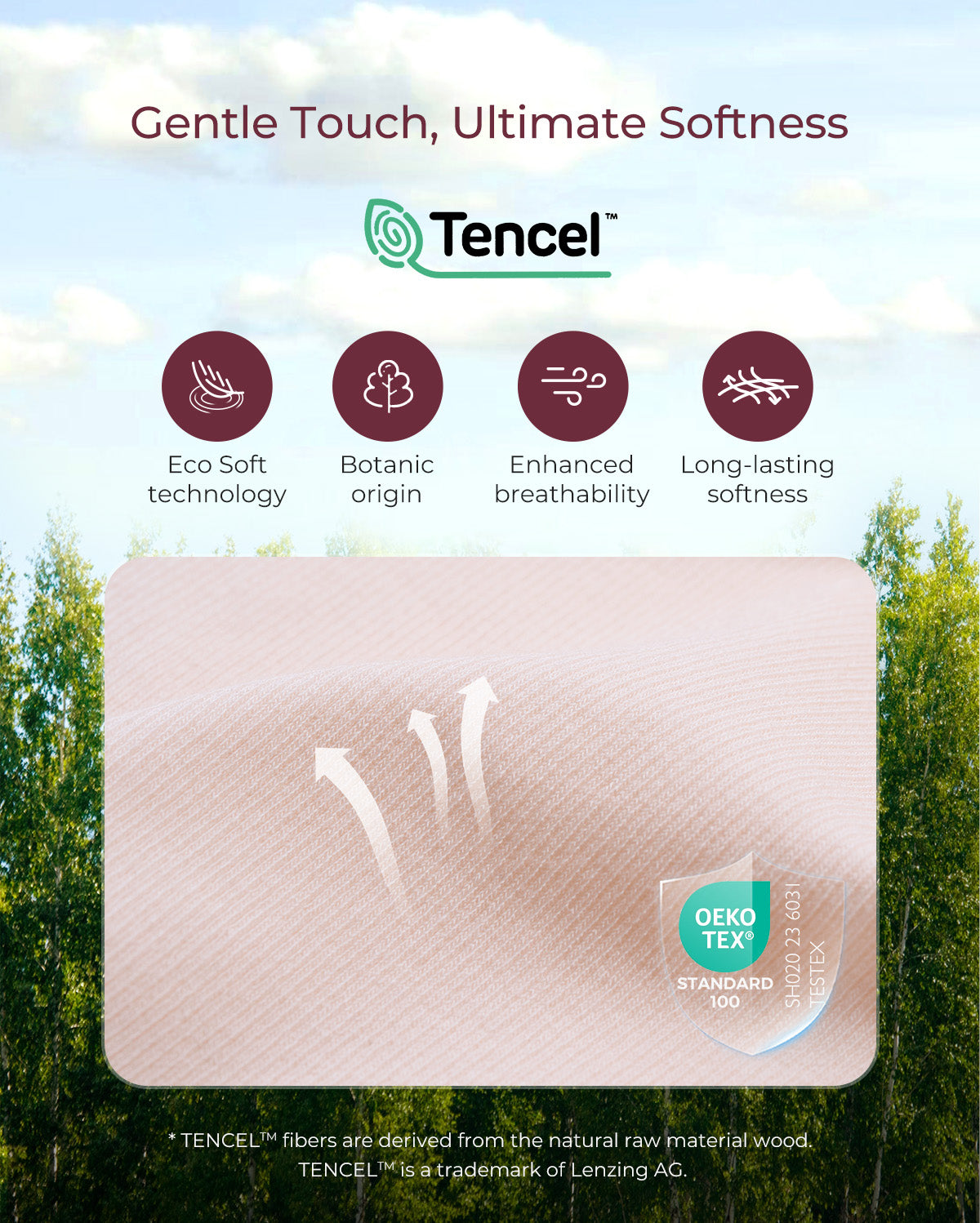 Eco Soft Technology Sustainable softness derived from environmentally responsible processes. Botanic Origin Sourced from renewable wood, bringing nature’s touch to your skin. Enhanced Breathability Promotes airflow and moisture management to keep you cool and fresh. Long-Lasting Softness Retains its silky feel wash after wash, ensuring lasting comfort.