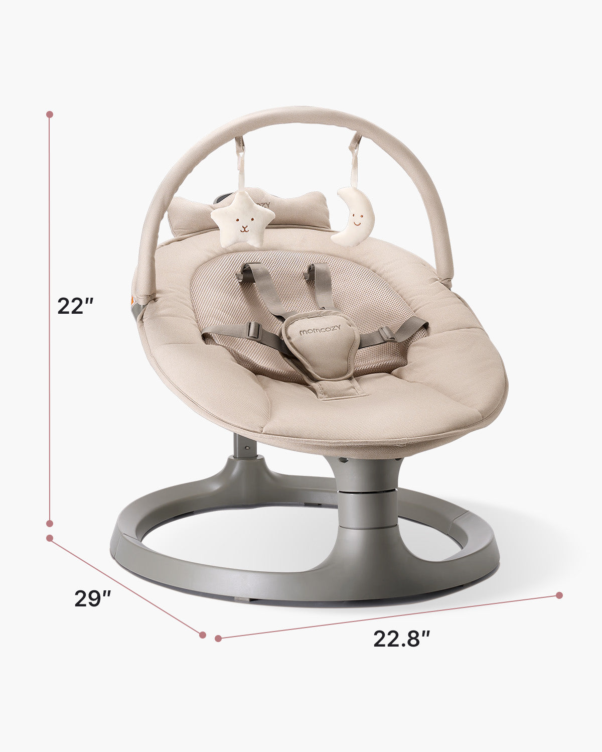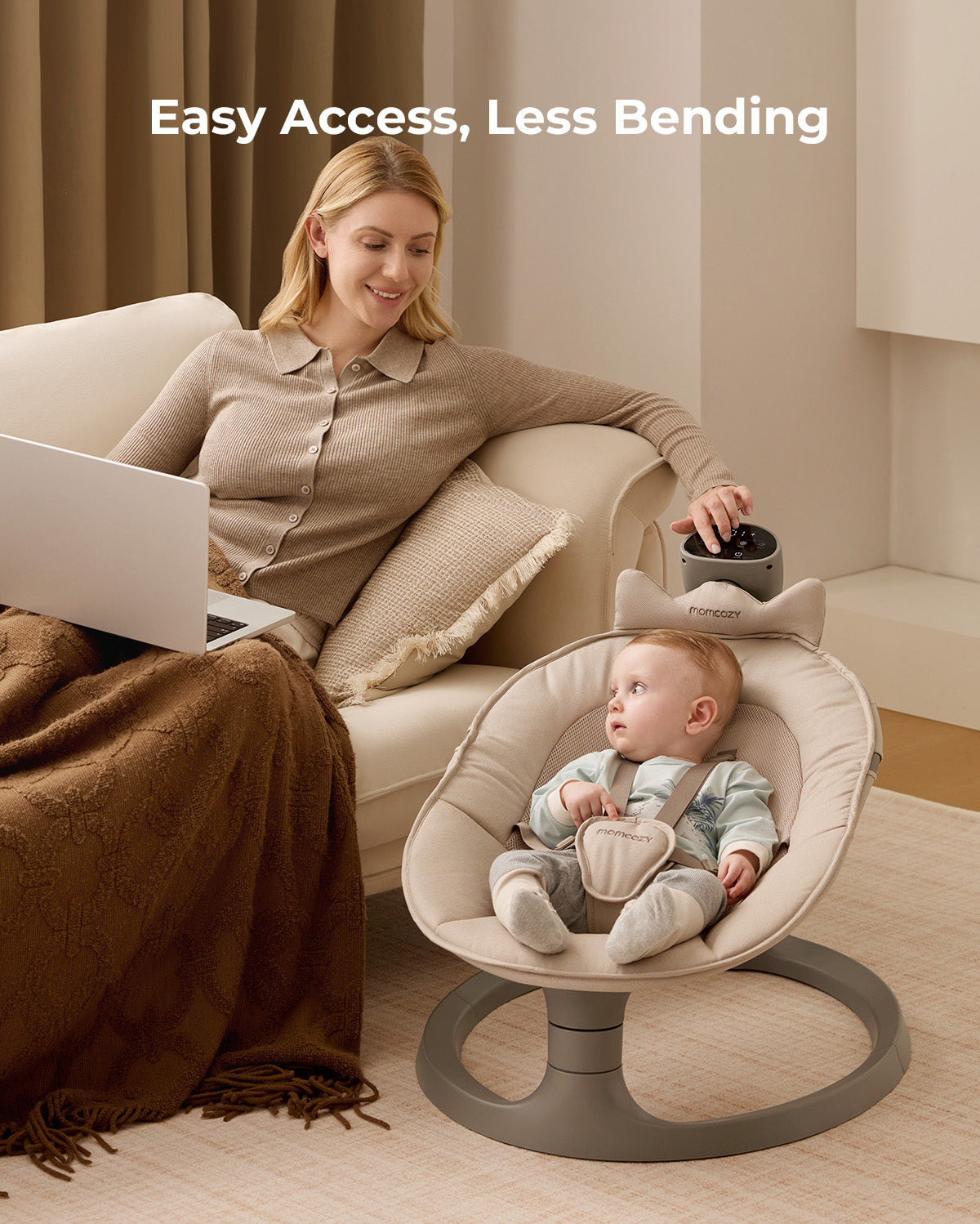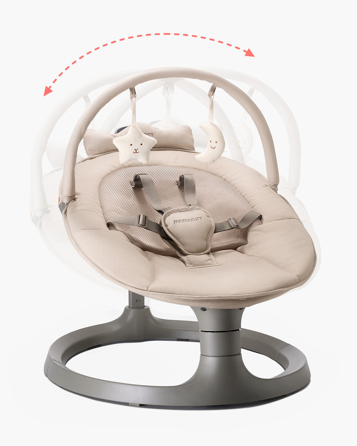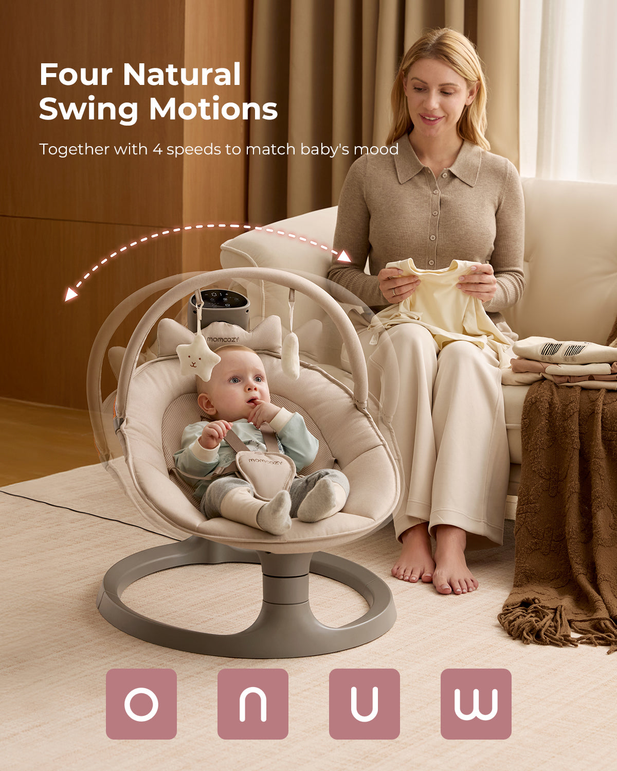 The Momcozy Electric Baby Swing gently mimics the way you cradle and soothe your baby, helping them stay calm and content—so you can enjoy a much-needed break. It features 4 parent-inspired swing motions and 4 adjustable speeds to match your little one's mood and pace, all supported by a dual-arm structure combined with a sturdy base for added safety and stability—unlike other infant swings that wobble. The comfortable, breathable seat with 2 recline positions creates a cozy space for your baby to rest or explore their surroundings, while two included plush toys and built-in lullabies offer even more ways to engage and soothe.