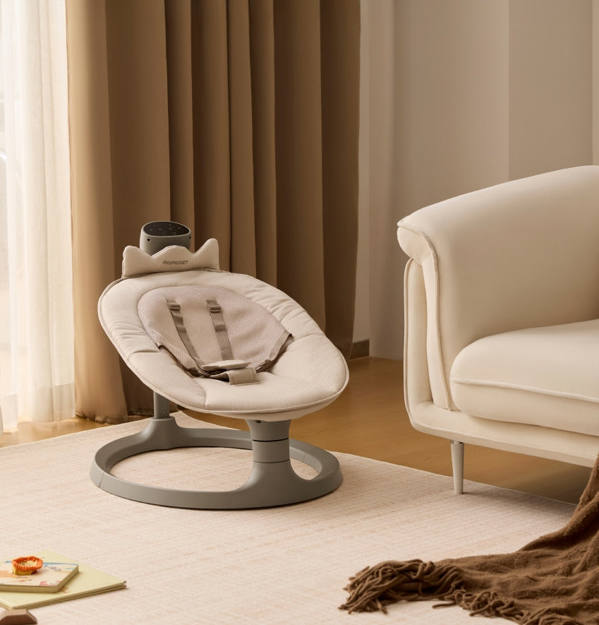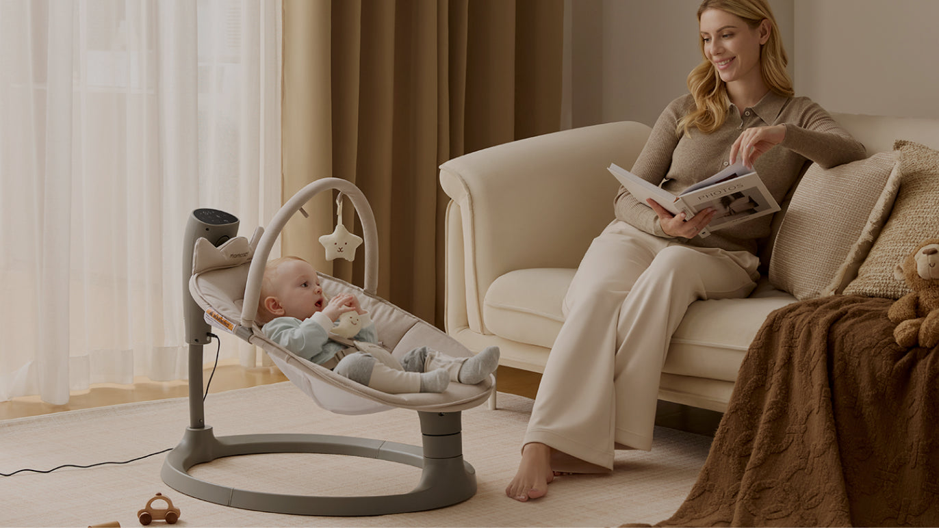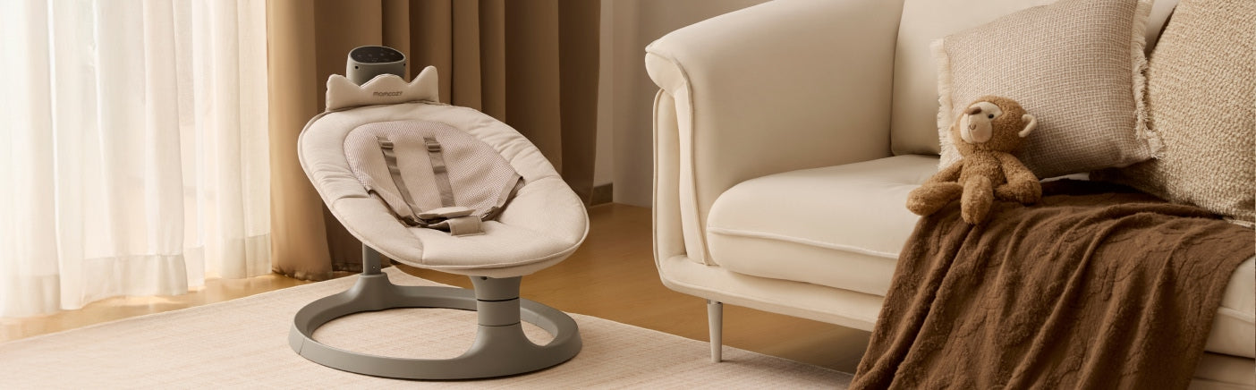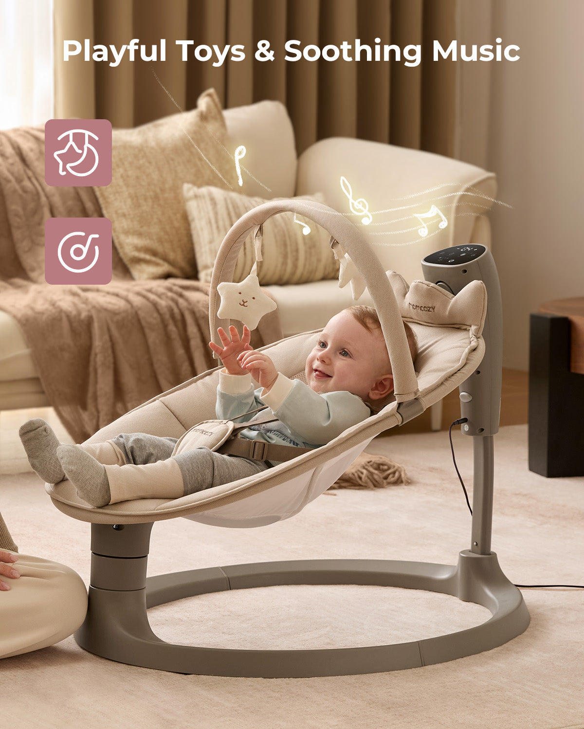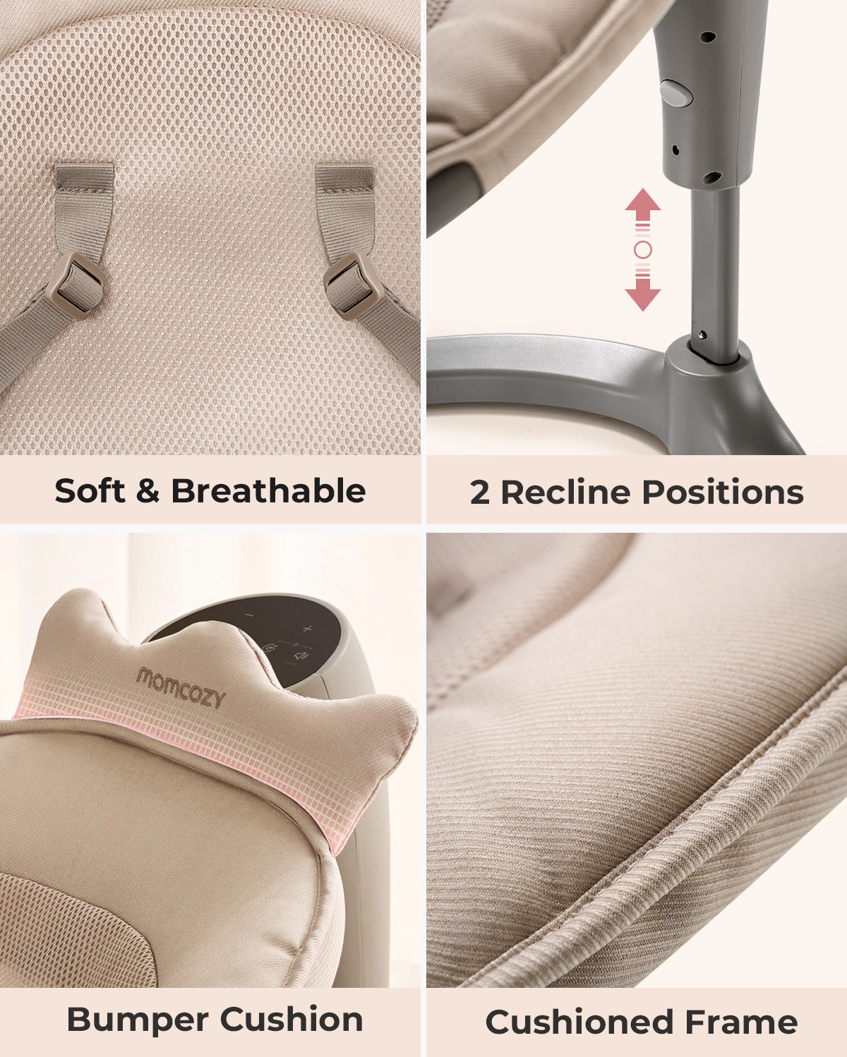 The Momcozy Electric Baby Swing gently mimics the way you cradle and soothe your baby, helping them stay calm and content—so you can enjoy a much-needed break. It features 4 parent-inspired swing motions and 4 adjustable speeds to match your little one's mood and pace, all supported by a dual-arm structure combined with a sturdy base for added safety and stability—unlike other infant swings that wobble. The comfortable, breathable seat with 2 recline positions creates a cozy space for your baby to rest or explore their surroundings, while two included plush toys and built-in lullabies offer even more ways to engage and soothe.
