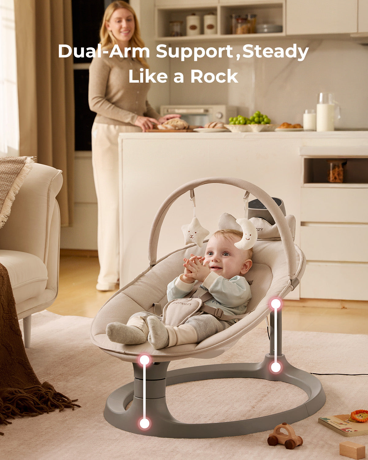 Designed with your baby's safety in mind, the baby swing chair is supported by dual arms and a sturdy base. A soft bumper cushion gently protects your baby's head from accidental bumps as they grow. No wobble, no bumps, no worries.