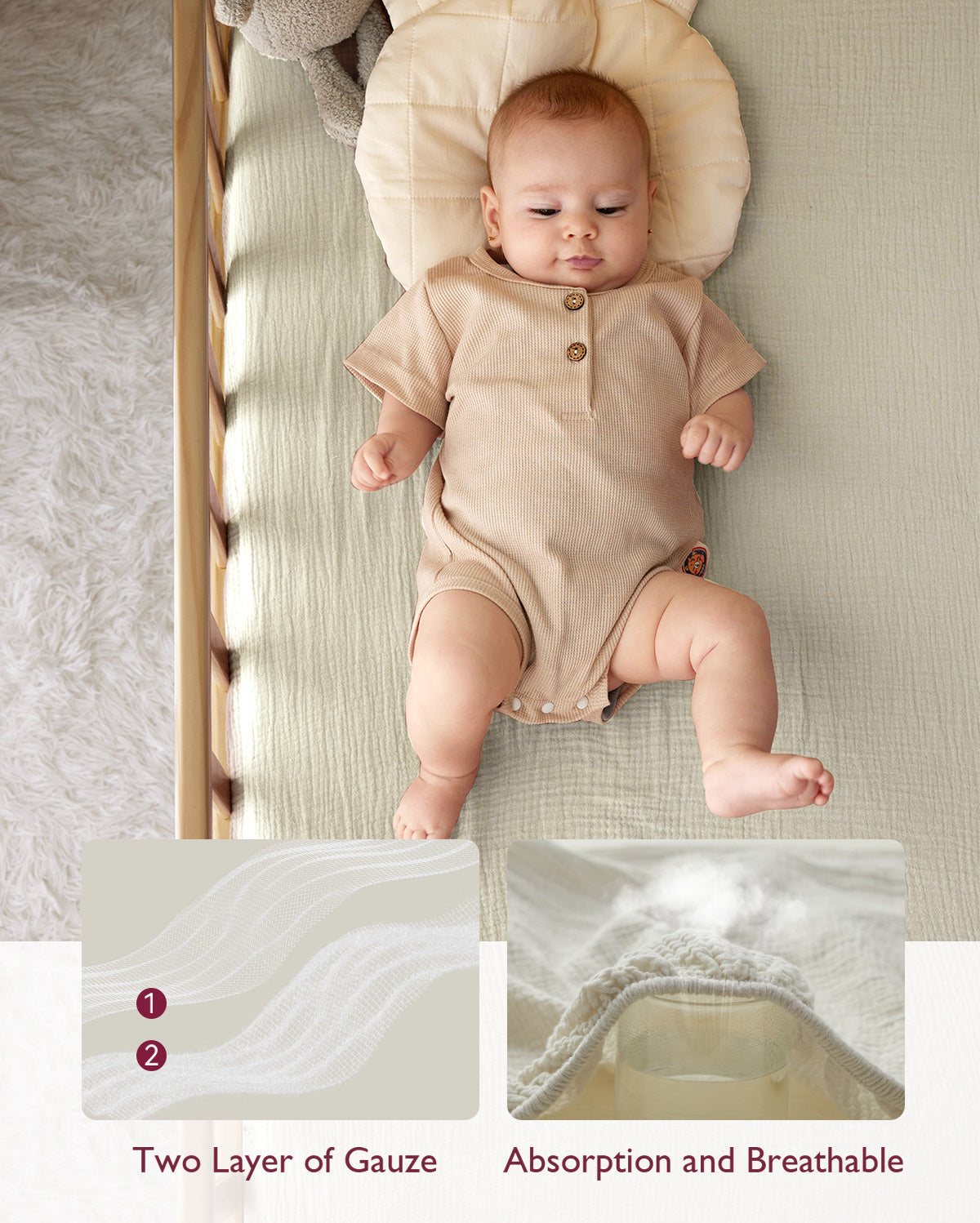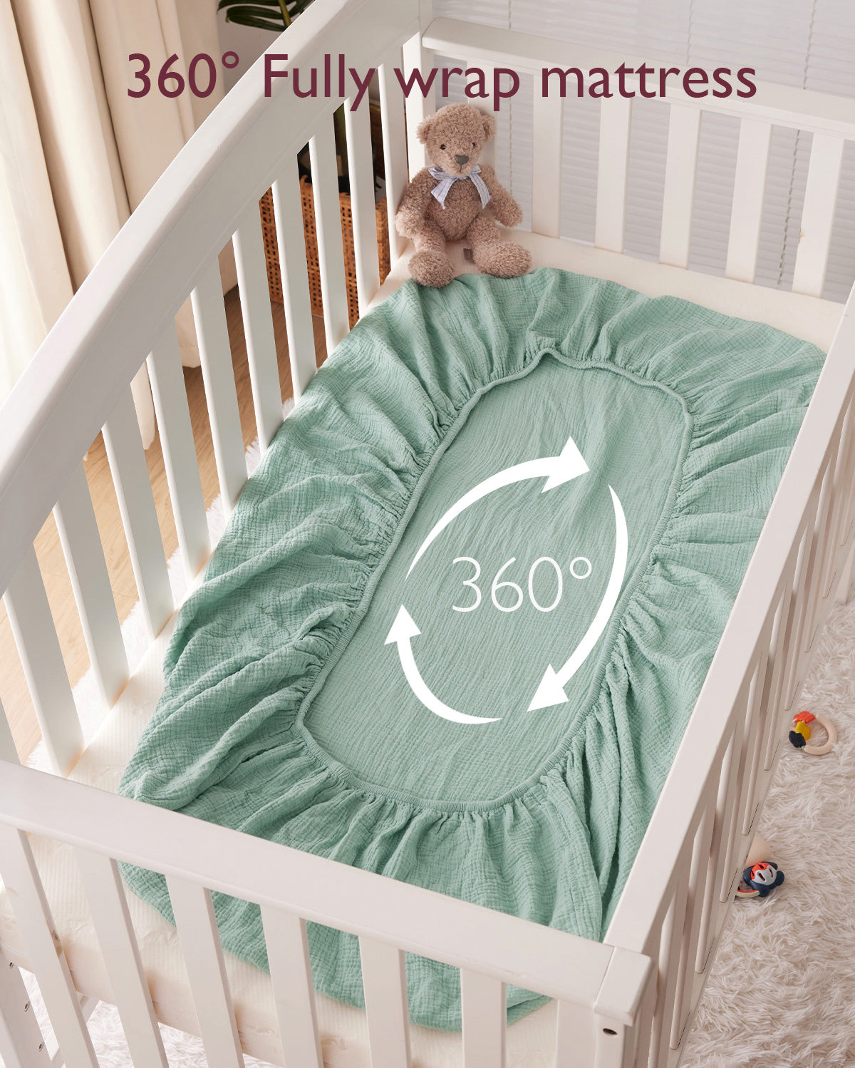 - 【Baby Sleep Soundly with Moisture-Absorbent and Breathable Fabric】Breathable and lightweight double-layer gauze boys and girls mattress crib sheet let baby breathe through bed sheet and mattress, allows for proper air circulation and doesn’t trap heat to help regulate baby's body temperature while they sleep. Absorbs extra moisture in the air promptly to keep baby body fresh and dry, suitable for all seasons, warm in winter and no hot sleeping in summer.
