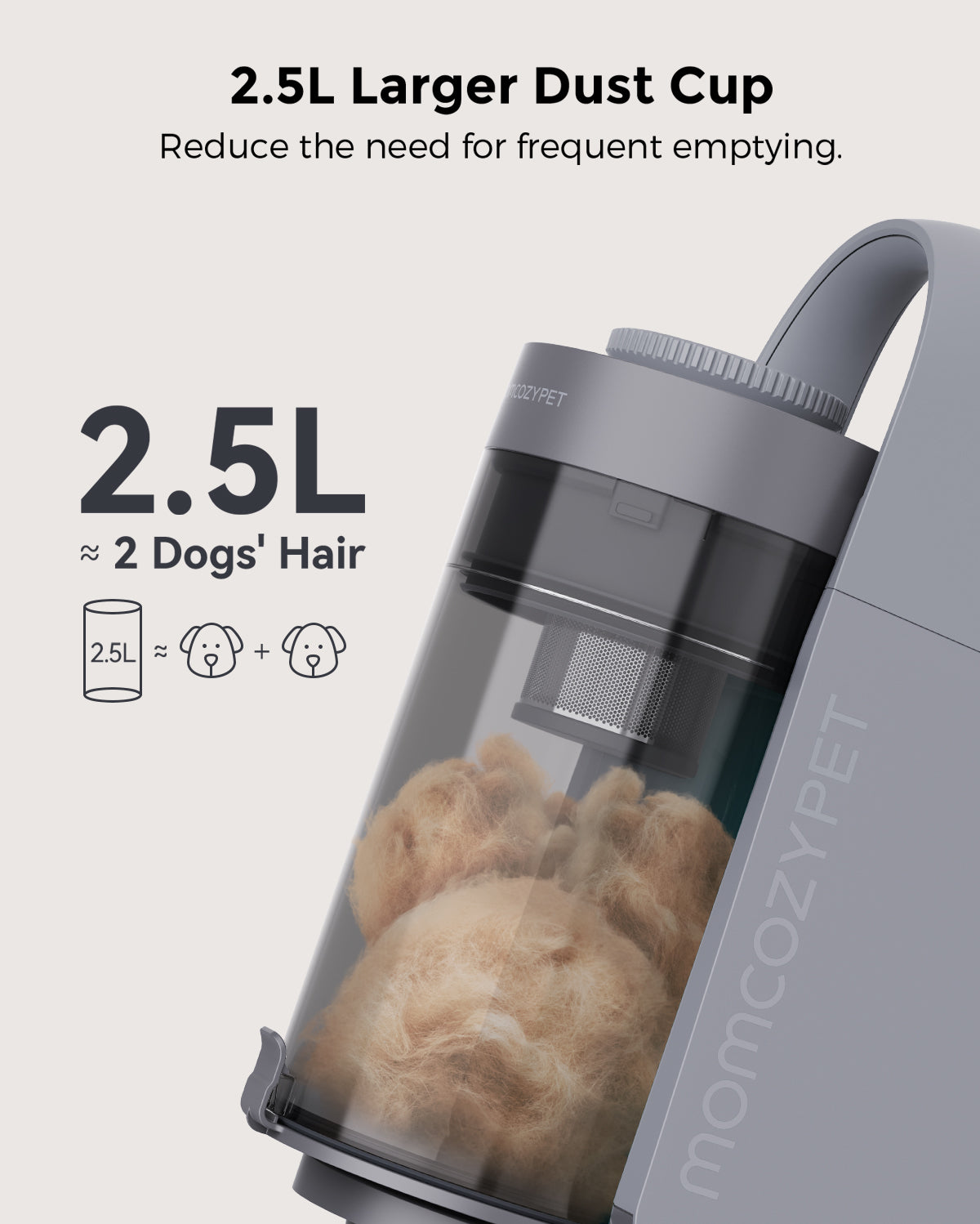 Extra-Large 2.5L Dust Cup: The spacious 2.5L dust cup holds twice the hair of standard containers, so you can groom multiple pets without constant trips to the trash.
