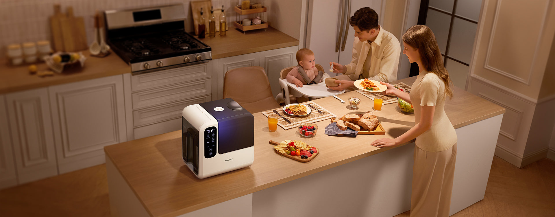 Low-water alert and lid-pause function for safe operation. Over-pressure protection prevents device damage.