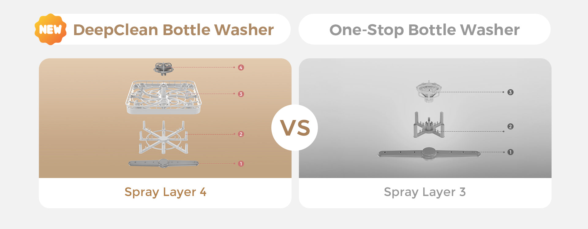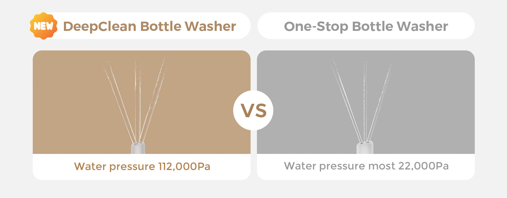 Powerful 112,000Pa warm water sprays dissolve tough, dried milk residue.