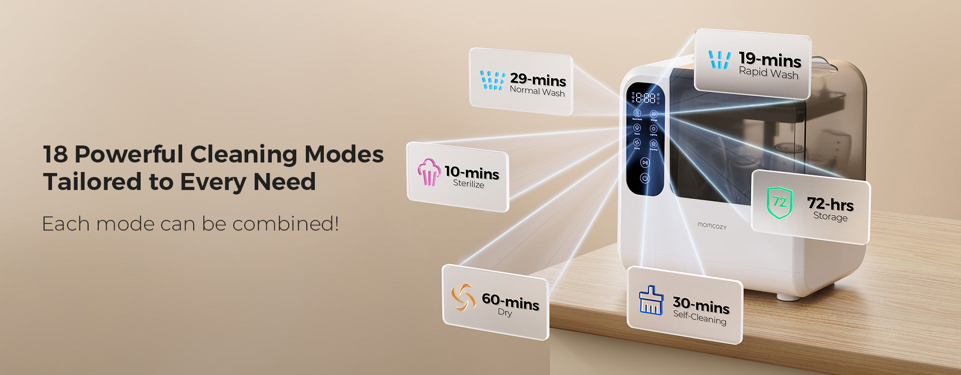 The Momcozy DeepClean Baby Bottle Washer offers 22 cleaning mode combinations, including Rapid Wash, Normal Wash, Steam Sterilize, Dry, Storage, and Self-Cleaning.