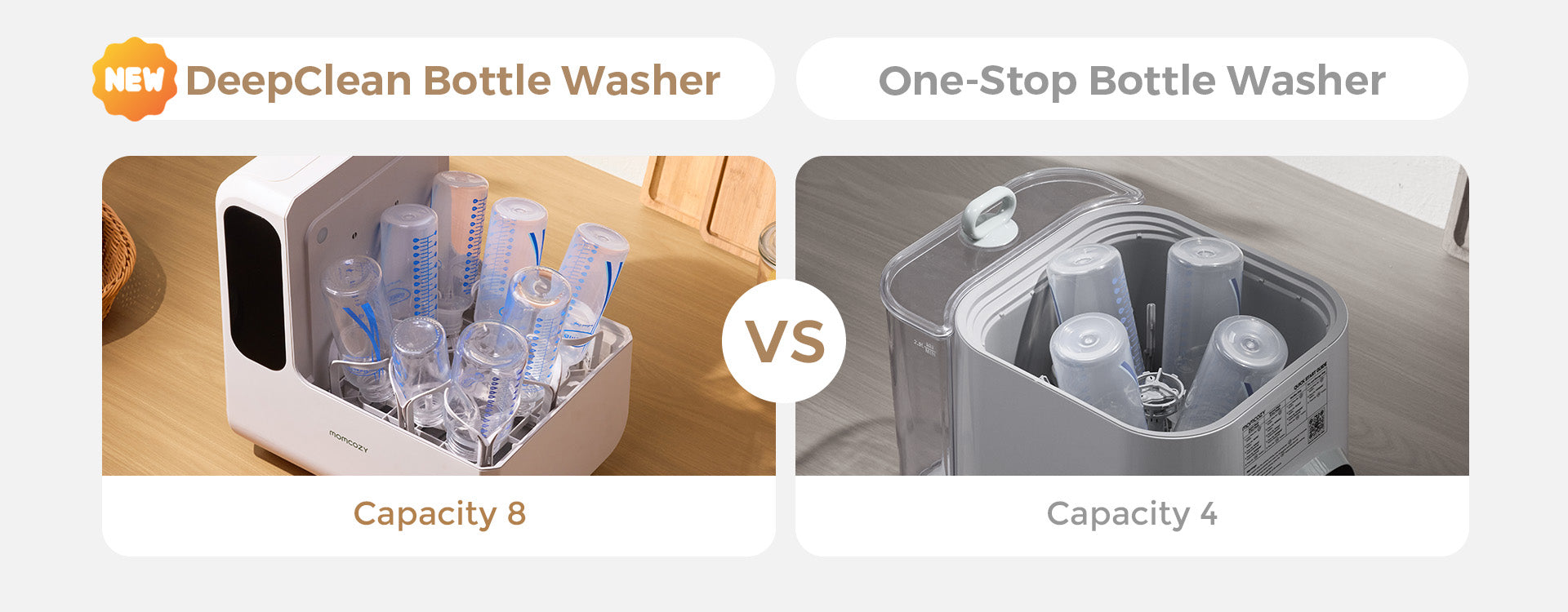 The Momcozy DeepClean Bottle Washer focuses on larger capacity and deeper cleaning, while the KleanPal Pro is designed for basic daily cleaning.